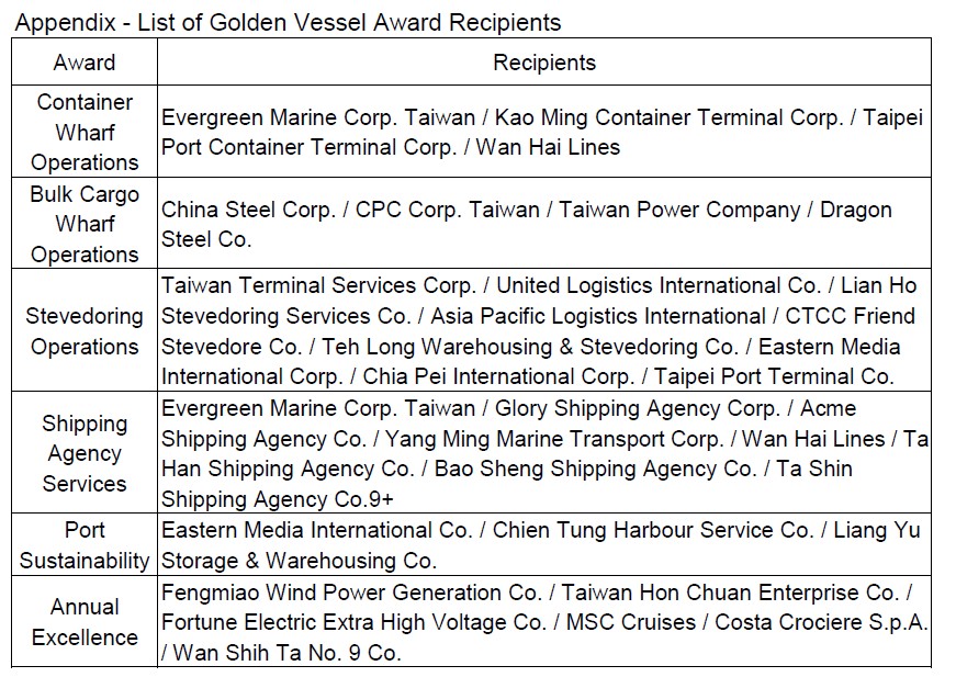 TIPC Chairman Hsien-yi Lee stated the record-breaking NT$22.8 billion in operating income reported by his company in 2024 could not have been achieved without the strong support and cooperation of MOTC officials, the Kaohsiung City Government, CIQS agencies, and port businesses. It was for this reason that TIPC chose to hold the 2024 Golden Vessel Award ceremony during TIPC’s 13th anniversary celebration to honor 34 businesses for their outstanding performance in container and bulk cargo wharf operations, stevedoring operations, shipping agency services, and port sustainability and for annual excellence. TIPC also took the opportunity to ask for the continued support of these firms in breaking new all-time records for TIPC ports this year.