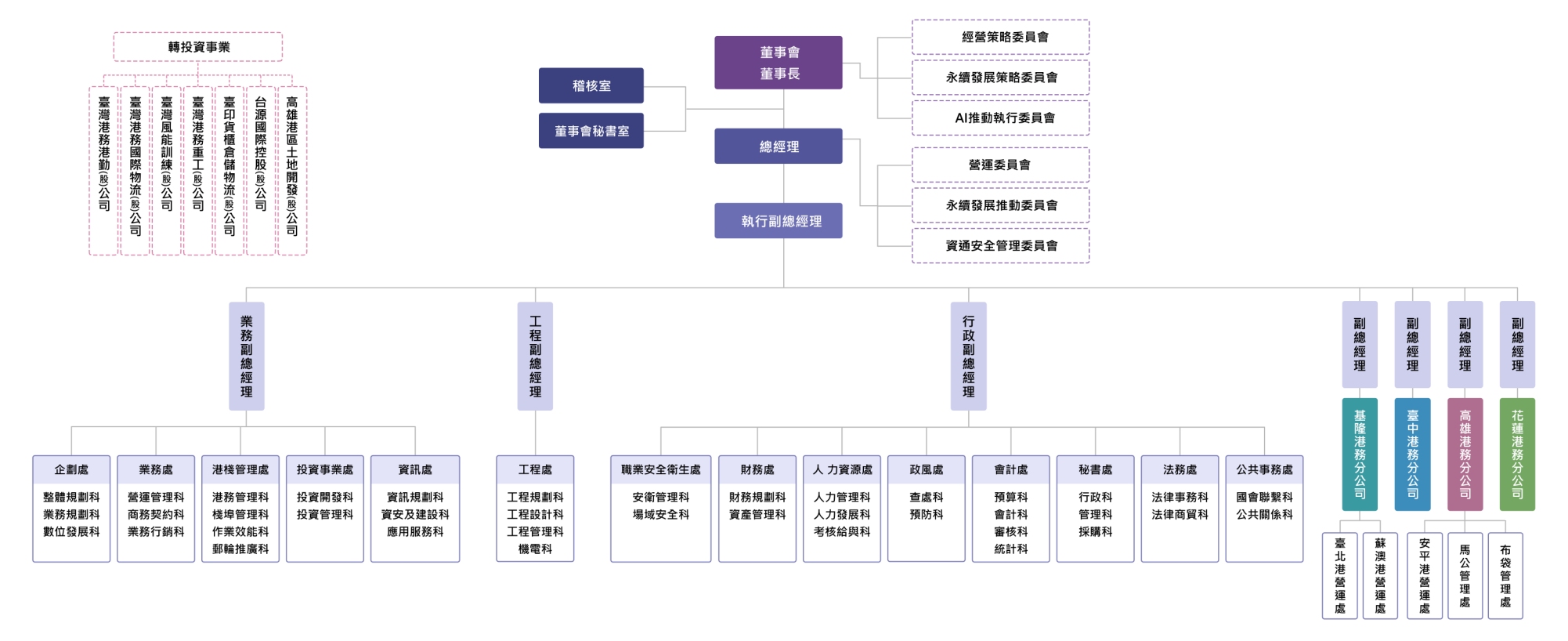 - 四、本公司設企劃處、業務處、港棧管理處、投資事業處、資訊處、工程處、職業安全衛生處、財務處、人力資源處、政風處、會計處、秘書處、法務處、公共事務處,掌理本公司各項業務;並設基隆港務分公司、臺中港務分公司、高雄港務分公司及花蓮港務分公司,負責各國際港之經營及管理。